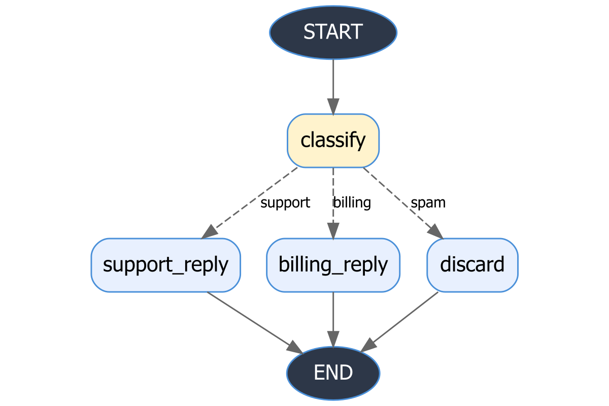 g$export_diagram("workflow.png", width = 1200L, height = 800L)Here is an example PNG exported from the email triage graph (classify - route to support/billing/discard):